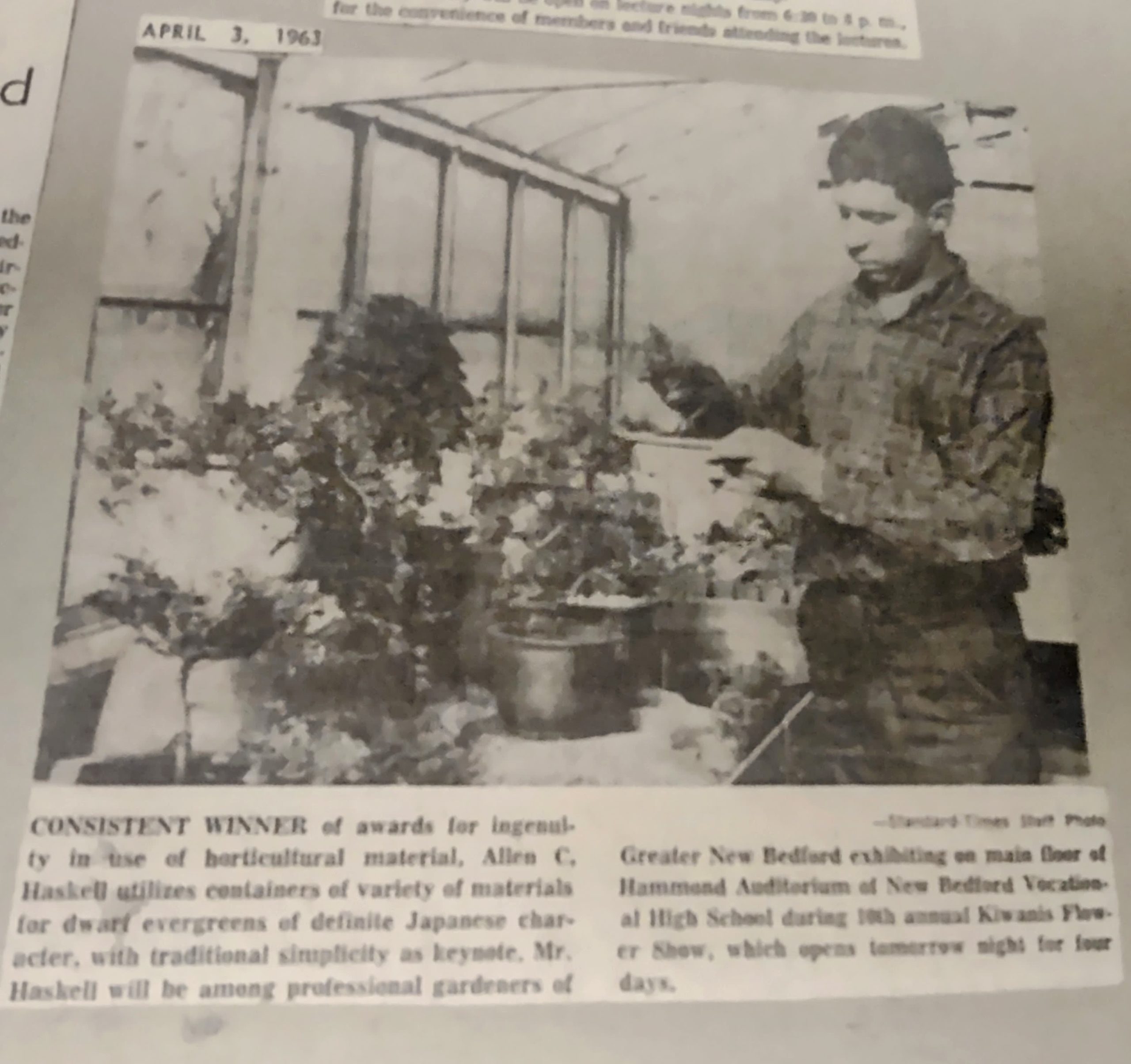 Allen Haskell, who became a nationally renowned horticulturist, impressed the club with his expertise at an early age. At the suggestion of President Margaret Carrier (1957-’59) the club decided in lieu of a scholarship to award a young Haskell a cash check for $300 to buy equipment. At the age of 28, he was awarded the President’s Cup at the Boston Flower Show. This honor was considered the most prestigious nationwide by horticulturists.