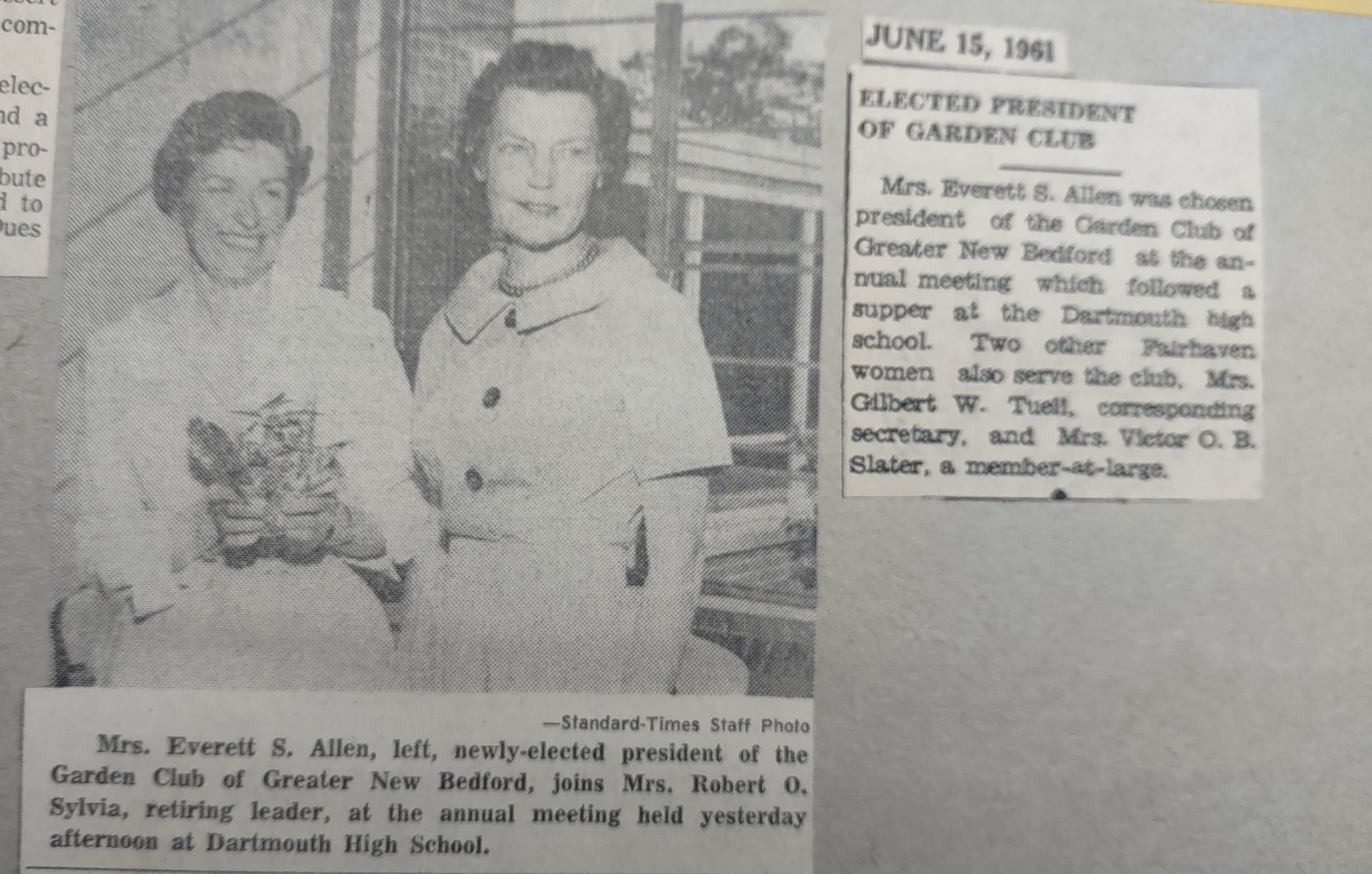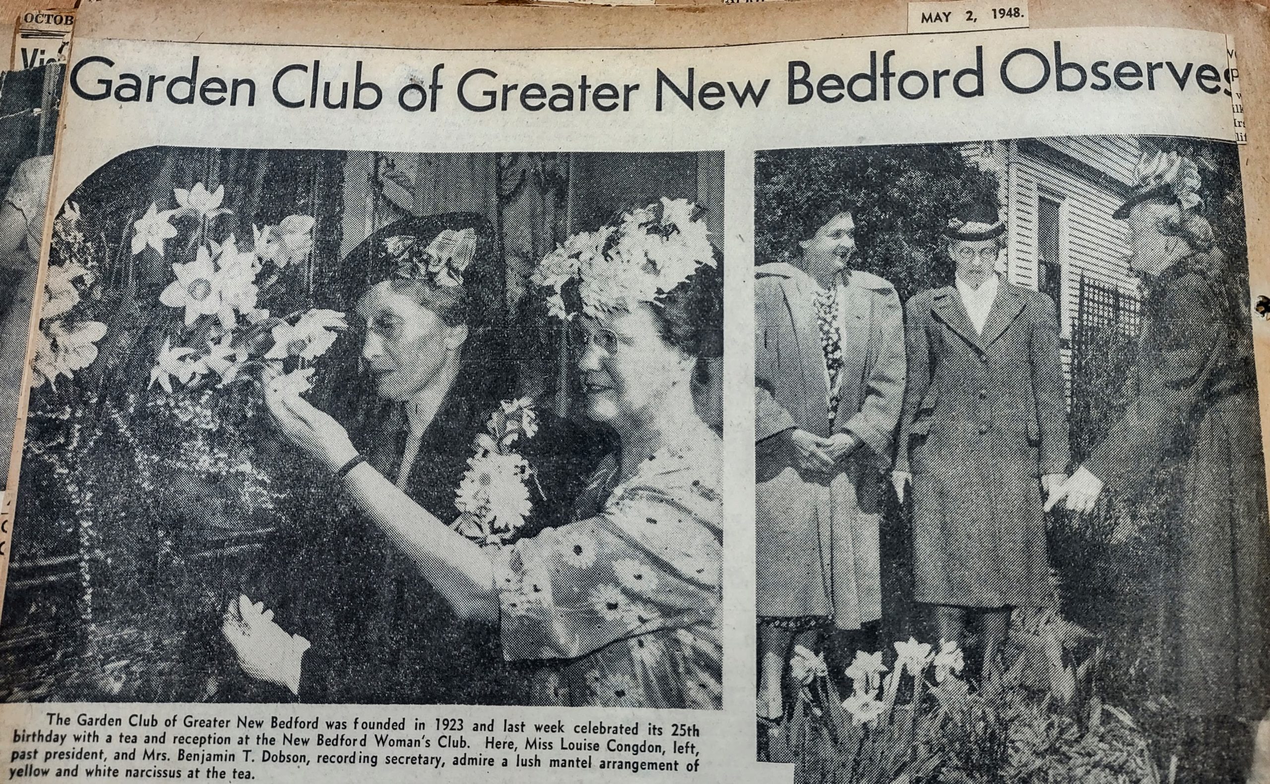 The oldest records date to 1934, when meticulous records of the club’s activities attest to the design and planting of yews at the center library. The Garden Club pioneered the first year of the Community Gardens project, later sponsored by the Women’s Organization of New Bedford and The Standard-Times. Garden Therapy members visited shut-ins at the Otis Air Force Base Hospital. Our Garden Therapy program continues today with members visiting two or more Greater New Bedford Assisted Living or Nursing homes where they create floral arrangements with the residents.